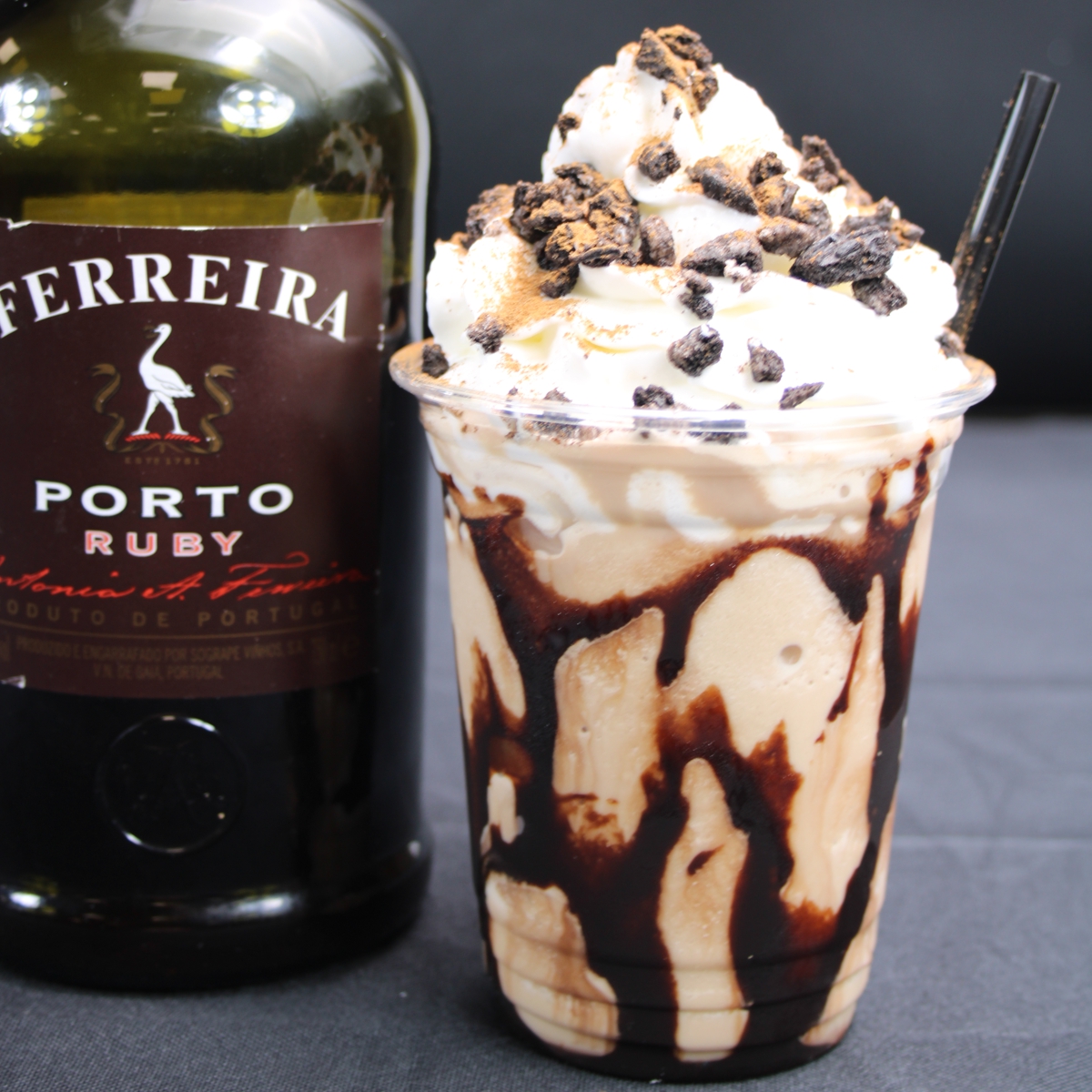 30g Frappé Moka White Chocolate 10ml de Syrup de Chocolate Toschi 30ml Leite Gordo 50ml Vinho do Porto Tawny 180g de Gelo RECIPIENTE 1 Copo RPET 300ml DECORAÇÃO 30ml Topping de Chocolate Toschi 20g Granulado Cookies Cream Monza 5g Canela em pó 40ml Chantilly |