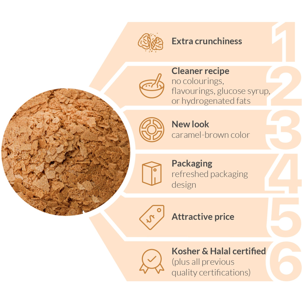 Flocos de crepe dentelle castanho-caramelo com um delicado sabor a caramelo. Agora ainda mais crocantes, com uma receita mais pura e uma apetitosa cor castanho-caramelo.