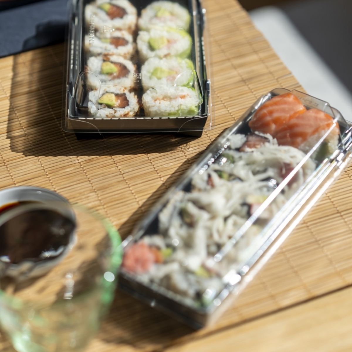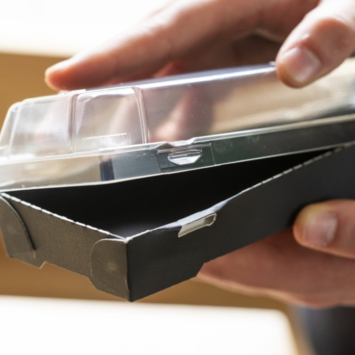 O nosso novo tabuleiro de cartão sustentável, o seu novo tabuleiro de sushi ou o tabuleiro de travessas para qualquer alimento refrigerado para levar, incluindo produtos de pastelaria e padaria.