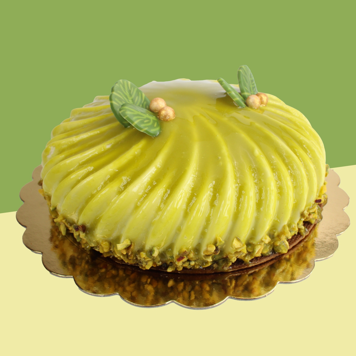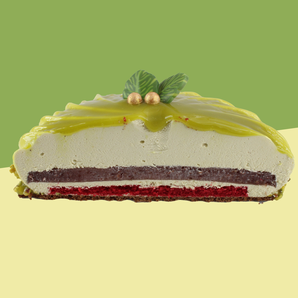 - Aquecer Coverglass ate 32ºC e verter sobre peça gelada - Colocar granulado de pistachio em volta do Semi frio