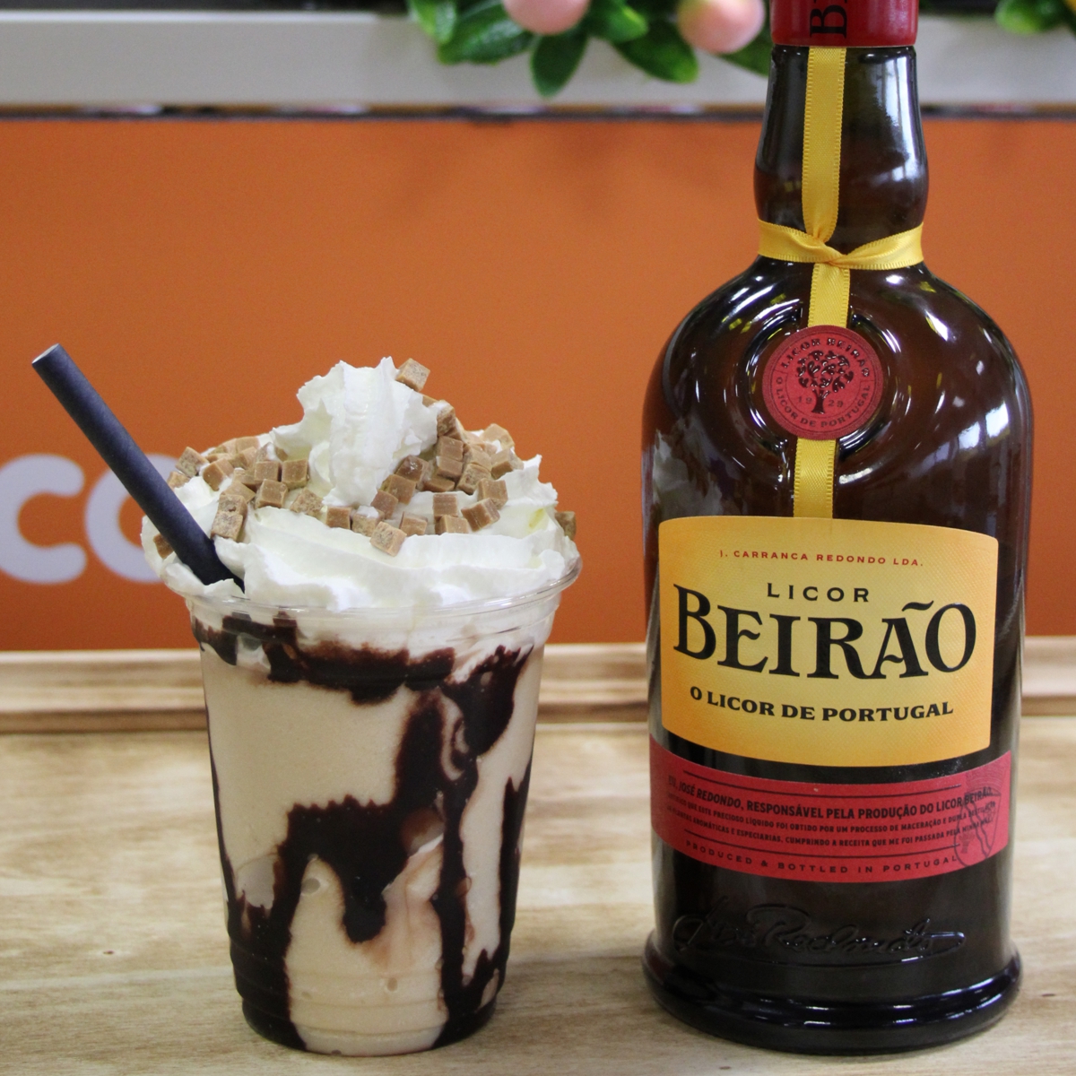 Adicionar Frappé Caramelo Salgado Moka, Licor Beirão, Leite/Bebida Vegetal e 180g de Gelo no liquidificador Maipor.